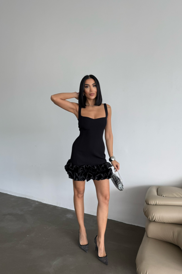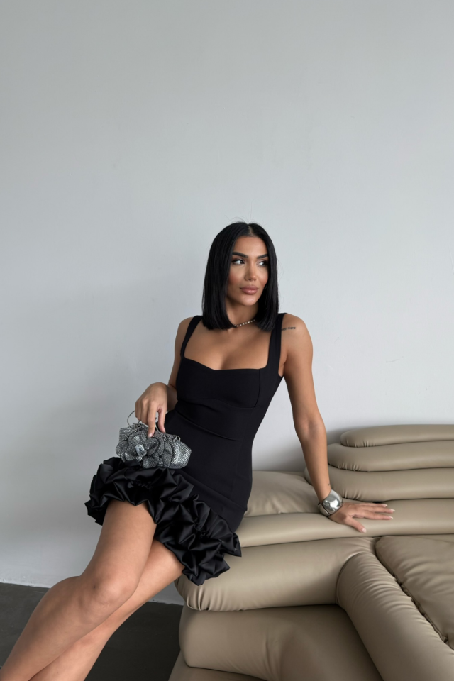 ASKILI KISA DAR ELBİSE ETEKUCU TASARIM KATLI - Siyah