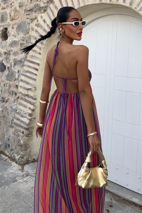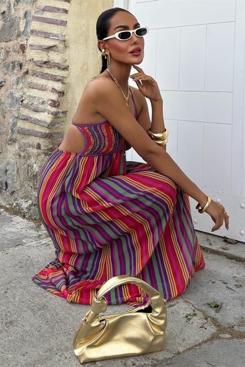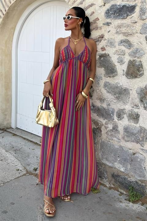 Askılı Pile Detaylı Renkli Maxi Elbise 2748