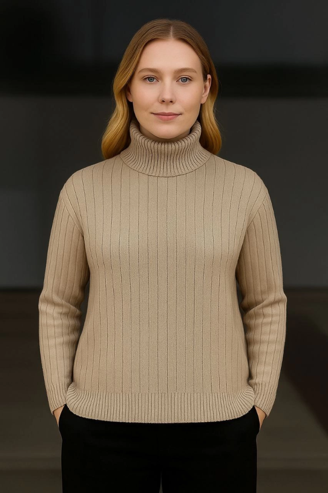 Balıkcı Yaka Bağazlı Triko Kazak Pamuklu Kalın Fitilli Dokuma - Bej