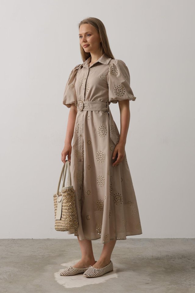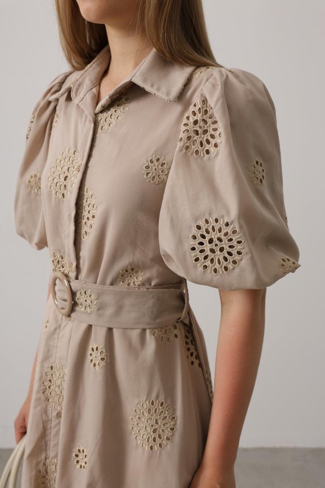 Balon Kol Kemerli Brode Elbise - Taş
