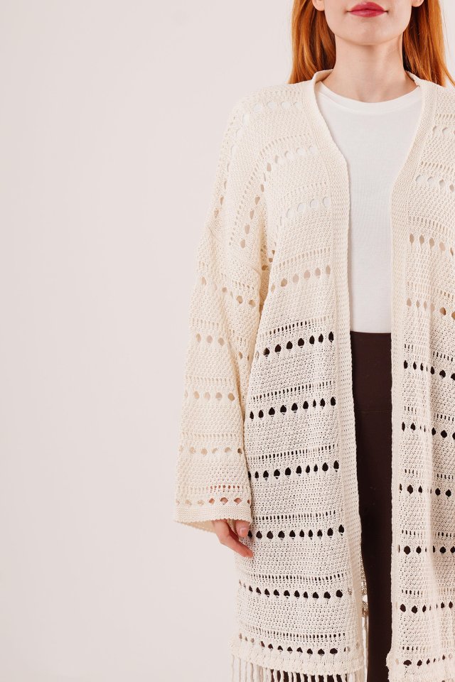 Delikli Geçişli Püskül Detay Uzun Triko Krem Hırka