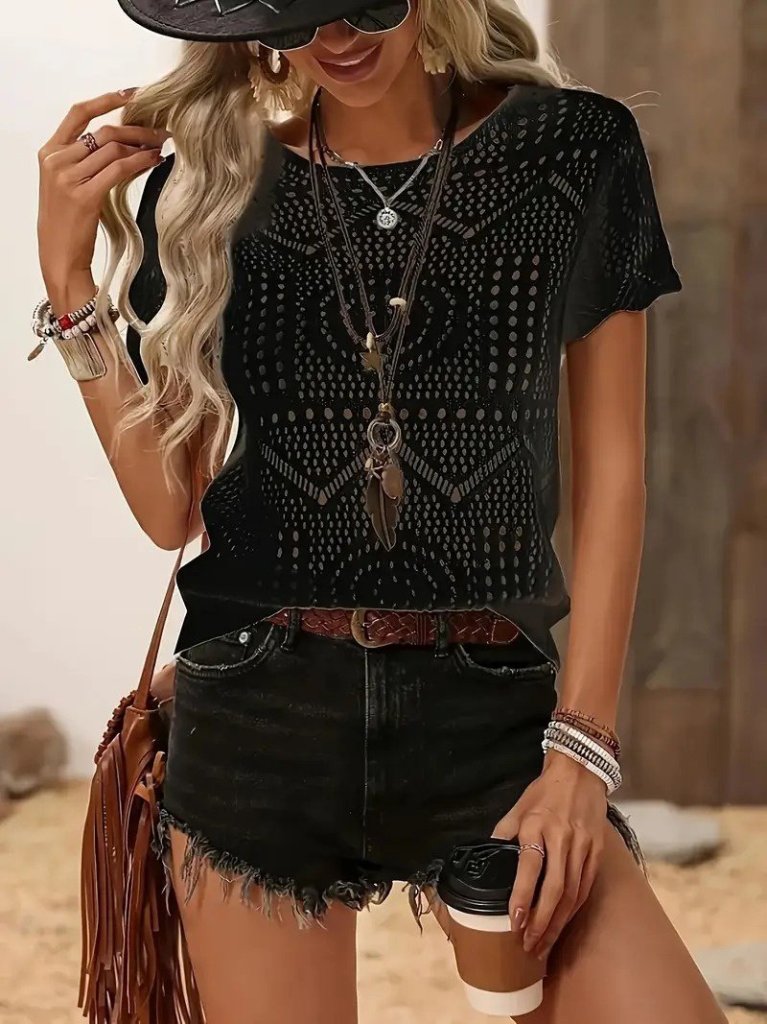 Kadın Kısa Kollu Bisiklet Yaka Desenli Triko Bluz