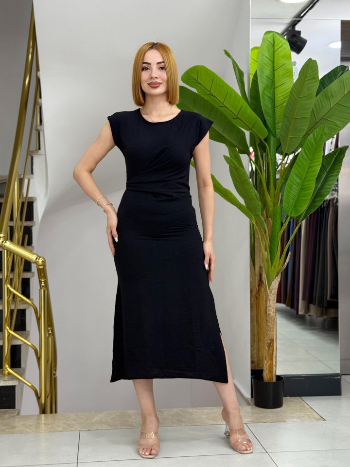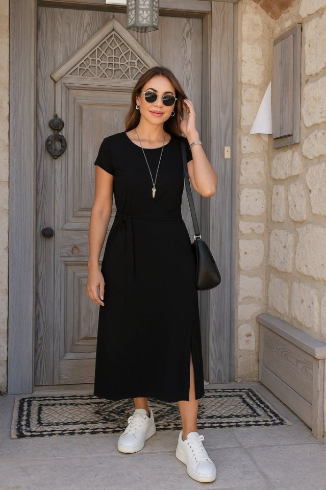 Kadın Kısa Kollu Yuvarlak Yaka Belden Bağcıklı önden Yırtmaçlı Aerobin Elbise