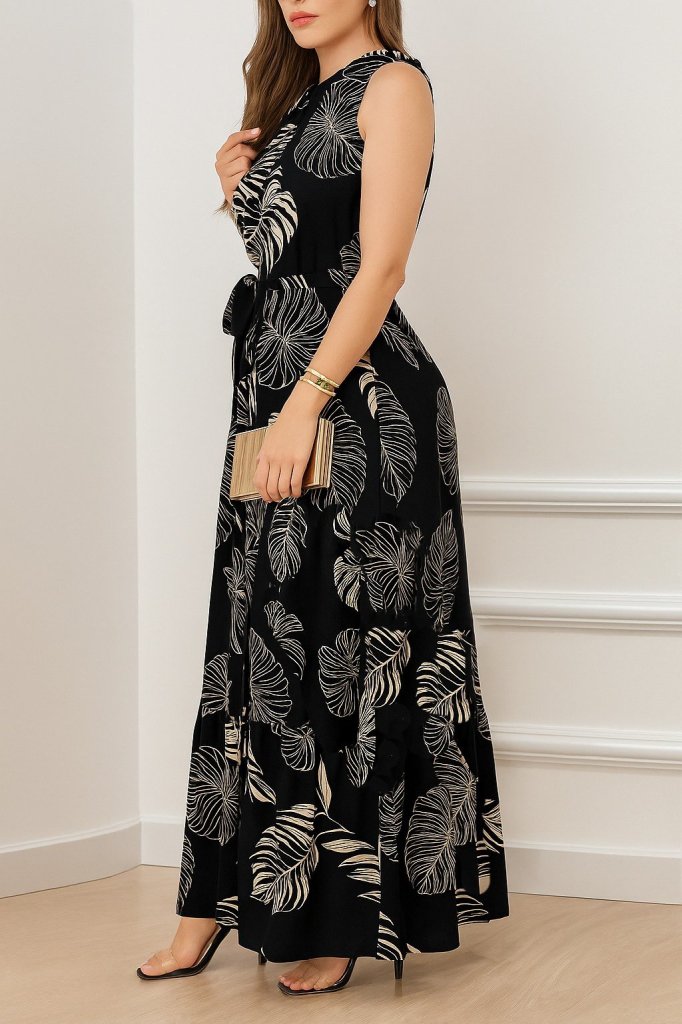Kadın Sıfır Kok Bağcıklı Kemerli Etek Ucu Fırfırlı Desenli Süprem Elbise