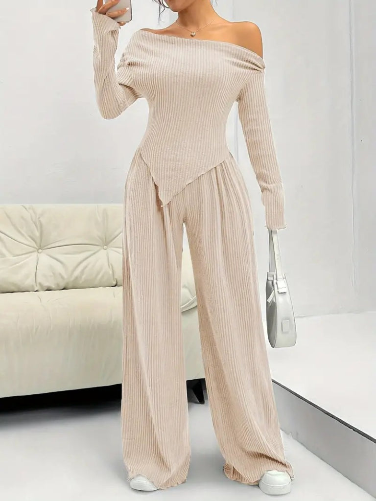 Kadın Uzun Kollu Omuzlardan Açık Asimetrik Kesim Kaşkorse Bluz Ve Pantolon Ikili Pantolon