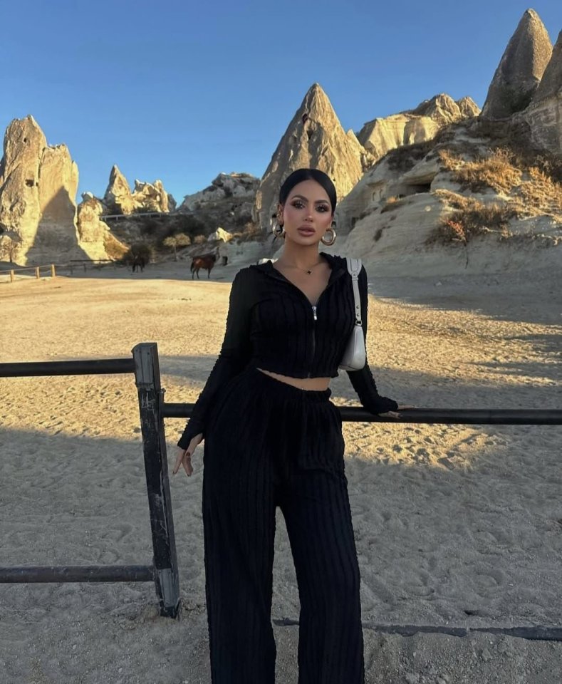 Kadın Uzun Kollu Parmak Geçme Ve Fermuar Detay Kısa Ceket Ve İspanyol Paça Pantolon Ikili Takim