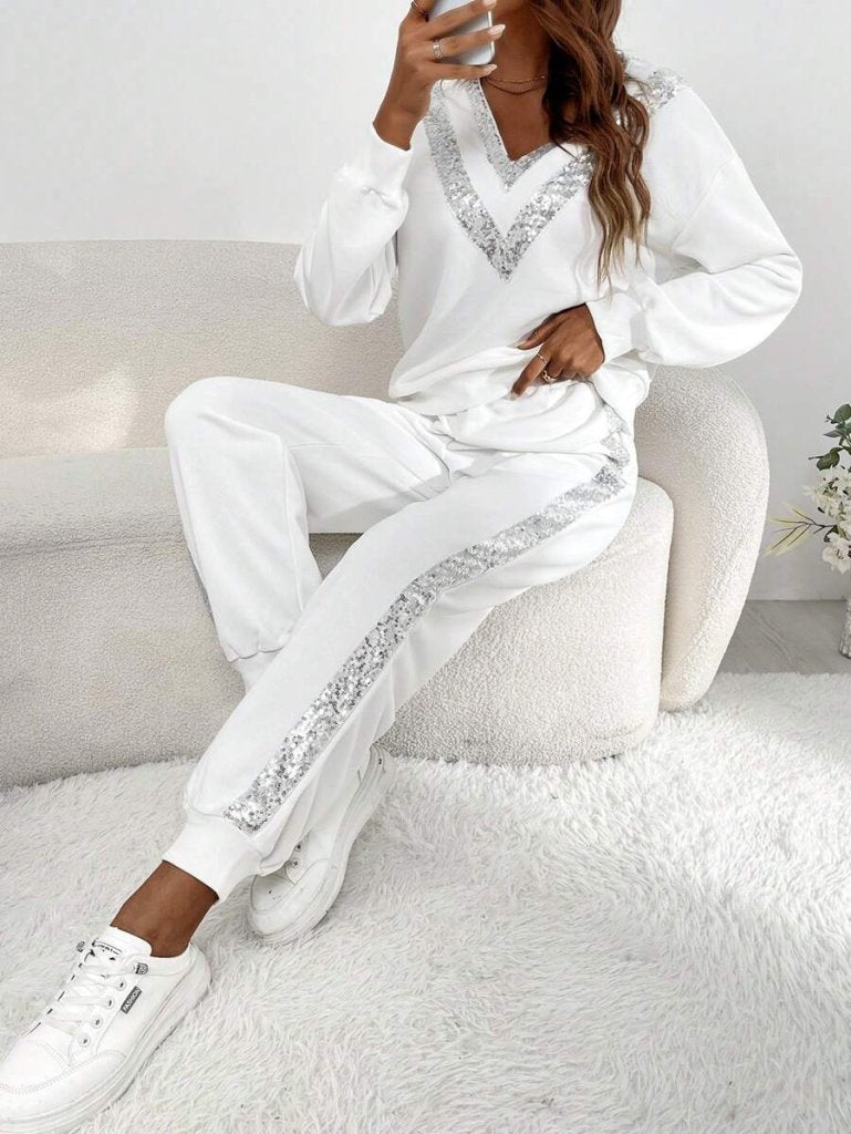 Kadın Uzun Kollu V Yakalı Pulpayetli Viskon Iki Iplik Bluz Ve Pantolon