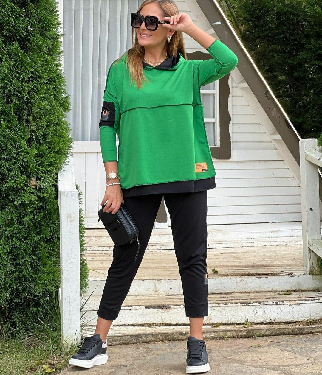 Kadın Yeşil Kapşonlu Etek Ucu Detay Arma Ters Dikiş Gorunumlu Ikili Takım