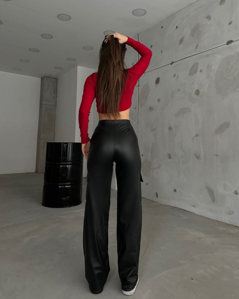 Kadın Yüksek Bel önden Fermuarlı Yandan Cep Detaylı Deri Kargo Pantolon