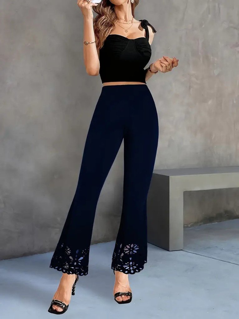 Kadın Yüksek Bel Paçaya Doğru Genişleyen Lazer çiçek Kesim Detaylı Ithal Krep Pantolon