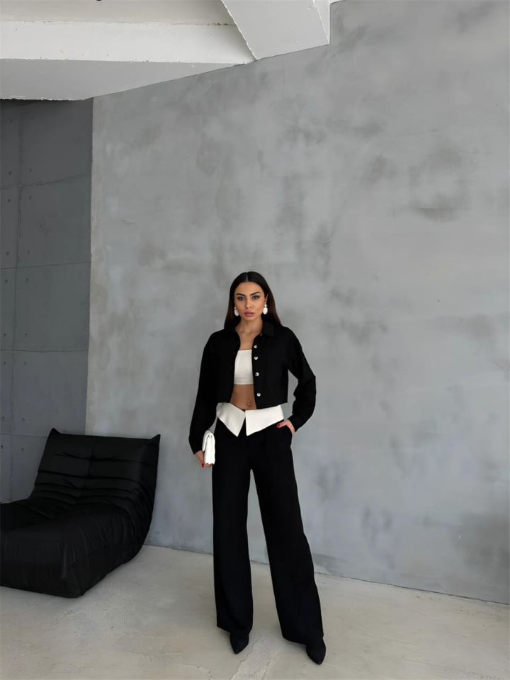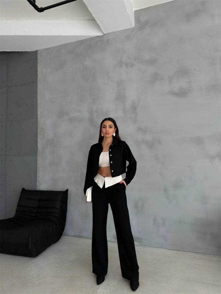 KETEN GÖMLEK-CROP-SALAŞ PANTOLON TAKIM - Siyah