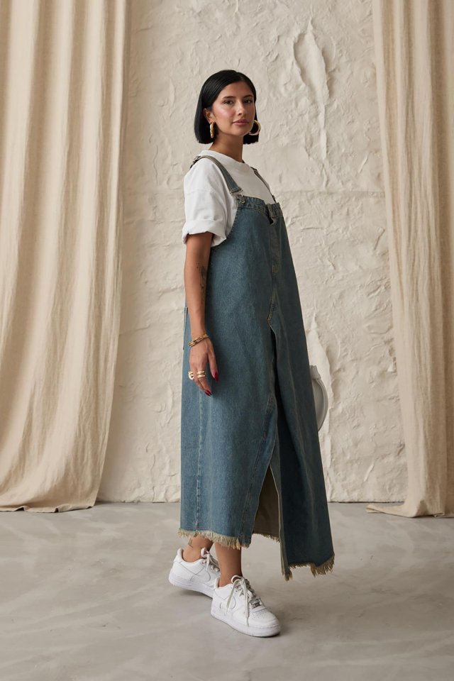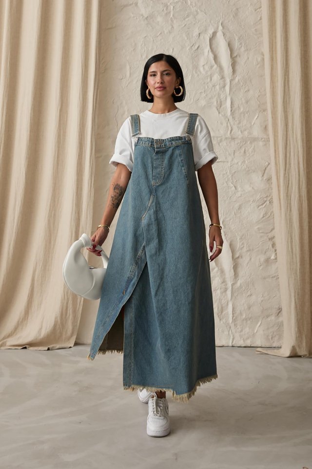 Mavi Askılı Düğmeli Kot Elbise
