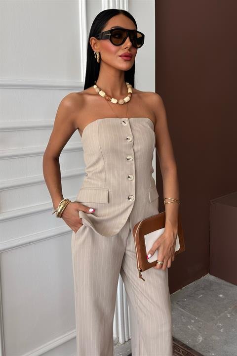 Straplez Büstiyerli Plazzo Pantolonlu Çizgili Takım 10151